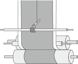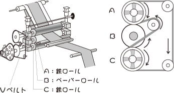 | [改善前] 鉄ロールAとペーパーロールBの間を筒状の生地が通っていた。この工程で生地目に歪みが生じた。原因は次の2つだった。 @Bロールは加圧だけで回っているためA・B2つのロールの速度は同じではなかった。 A鉄ロールA、Cを駆動させるVベルトはテンションをかけているため傷みが早くスリップして回転ムラが発生しやすかった。 |