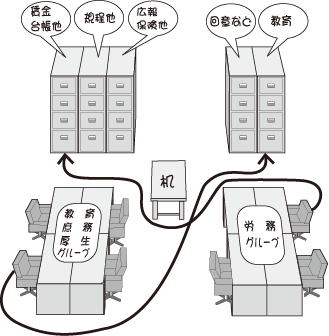 | [改善前] 総務部には5つのキャビネットがあったが、席替えで教育関係ファイルが教育グループから遠くなっていた。 |