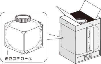 | [改善前] 液体染料はポリプロピレン容器をスチール枠で囲ったものに入れて出荷していたが、寒冷地で屋外に保管すると中身が凍結し、使用前に解凍する必要があった。 |