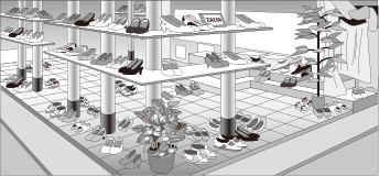 ■フロアにランダムに靴を並べた。これによってお客様は日常と同じ視線から靴を観察ことができ、気軽に履いてみることができるようになった。 取材先 神戸レザークロス 取材 1986/12/24 |
